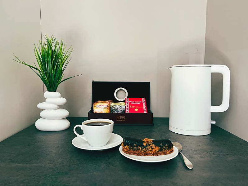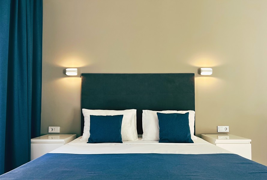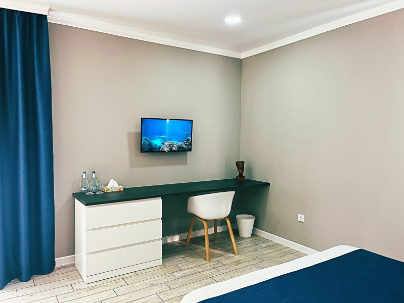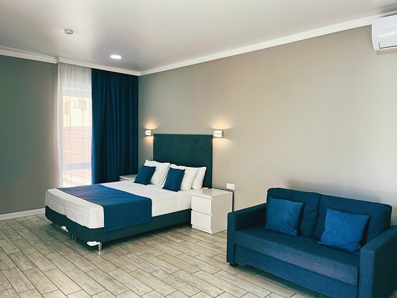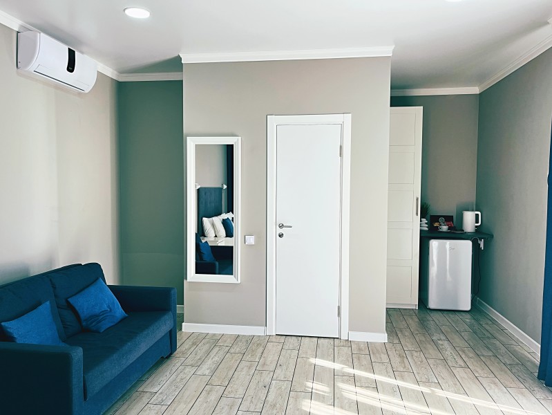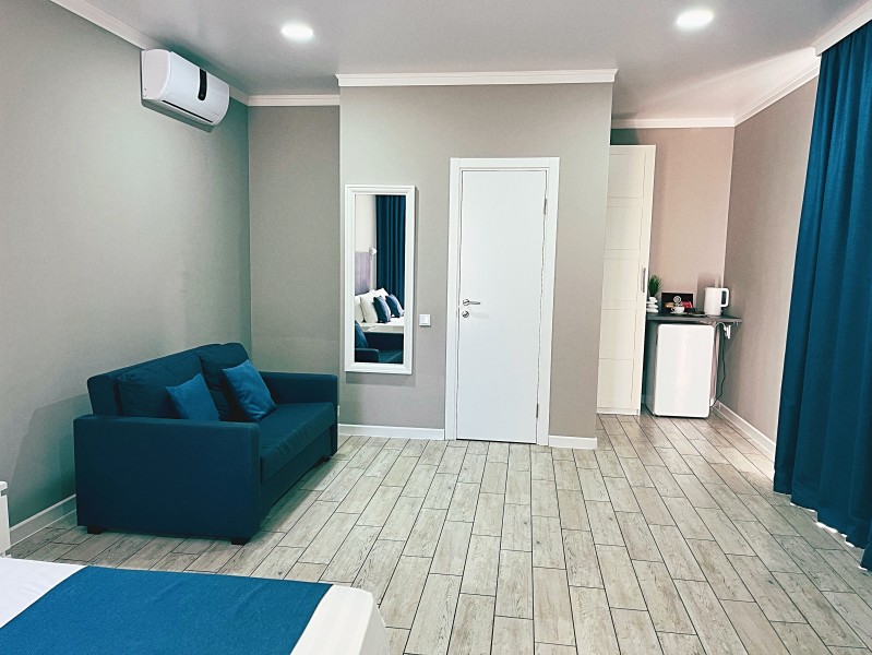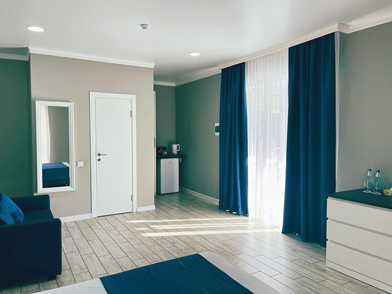 Номер с большой двуспальной кроватью и диваном кроватью. Расположен на первом этаже здания. Имеет собственную террасу с обеденным столом и креслами. Номер оснащен всем необходимым для комфортного отдыха: инверторная бесшумная сплит система, телевизор со smart tv, интернет по каналу Wi-Fi, удобный сан.узел с термостатическими смесителями, интерьерное освещение, большие панорамные окна, москитные сетки, постельное белье из белого страйп сатина, имеется меню из гиппоалергенных подушек, комплект махровых полотенец, комплект индивидуальных гигиенических средств (мыло, гель для душа, шампунь), пожарная сигнализация, теплый пол по всему помещению (для холодного времени года).