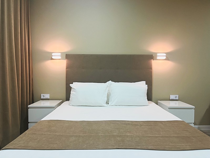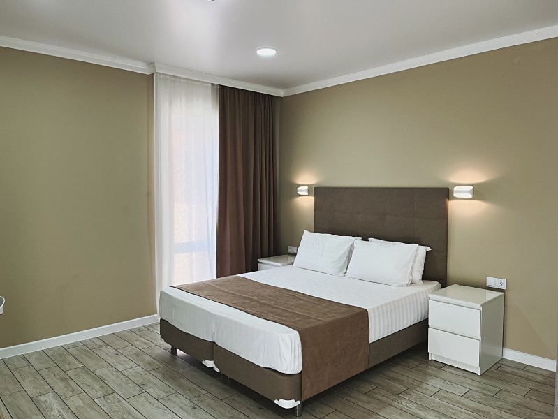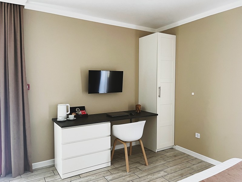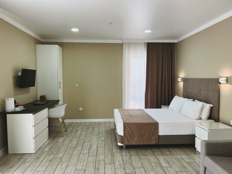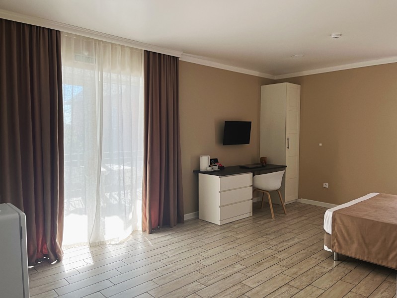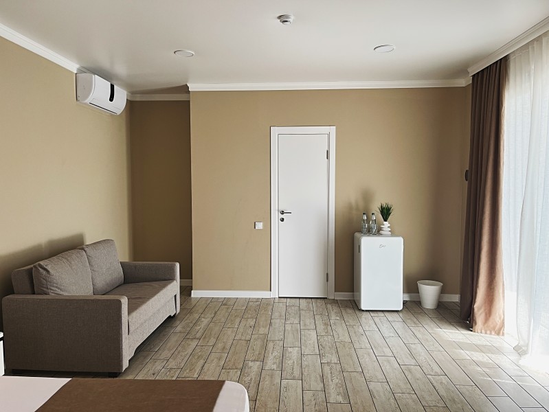Номер с большой двуспальной кроватью и диваном кроватью. Расположен на втором этаже здания. Имеет собственную террасу с обеденным столом и креслами. Номер оснащен всем необходимым для комфортного отдыха: инверторная бесшумная сплит система, телевизор со smart tv, интернет по каналу Wi-Fi, удобный сан.узел с термостатическими смесителями, интерьерное освещение, большие панорамные окна, москитные сетки, постельное белье из белого страйп сатина, имеется меню из гиппоалергенных подушек, комплект махровых полотенец, комплект индивидуальных гигиенических средств (мыло, гель для душа, шампунь), пожарная сигнализация, теплый пол по всему помещению (для холодного времени года).