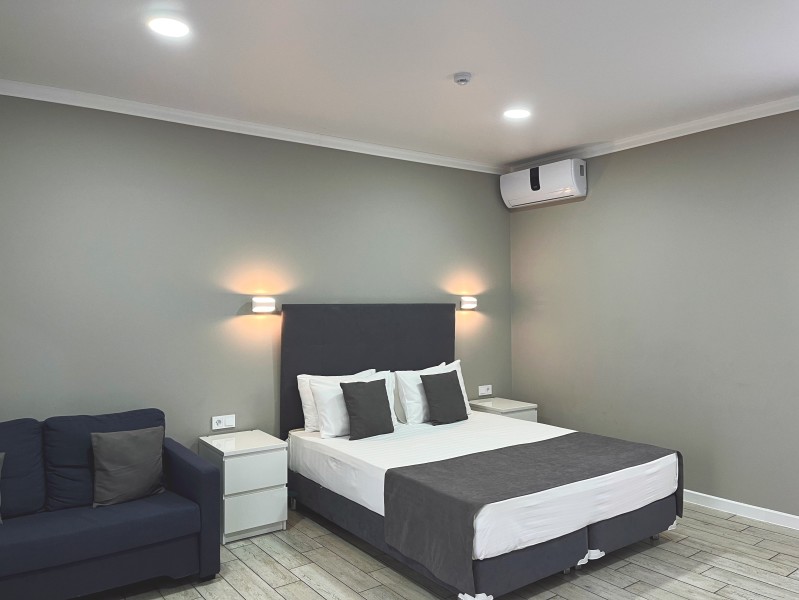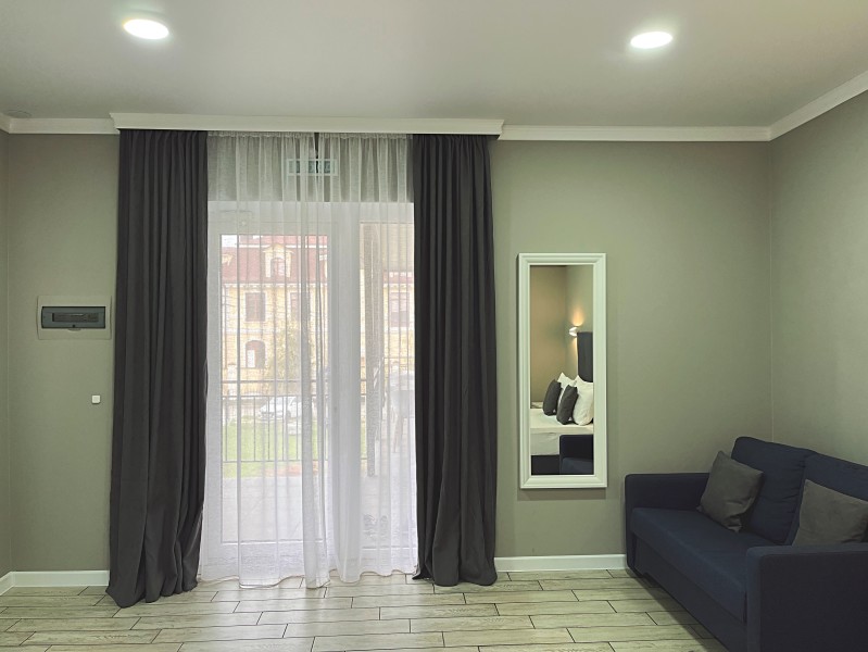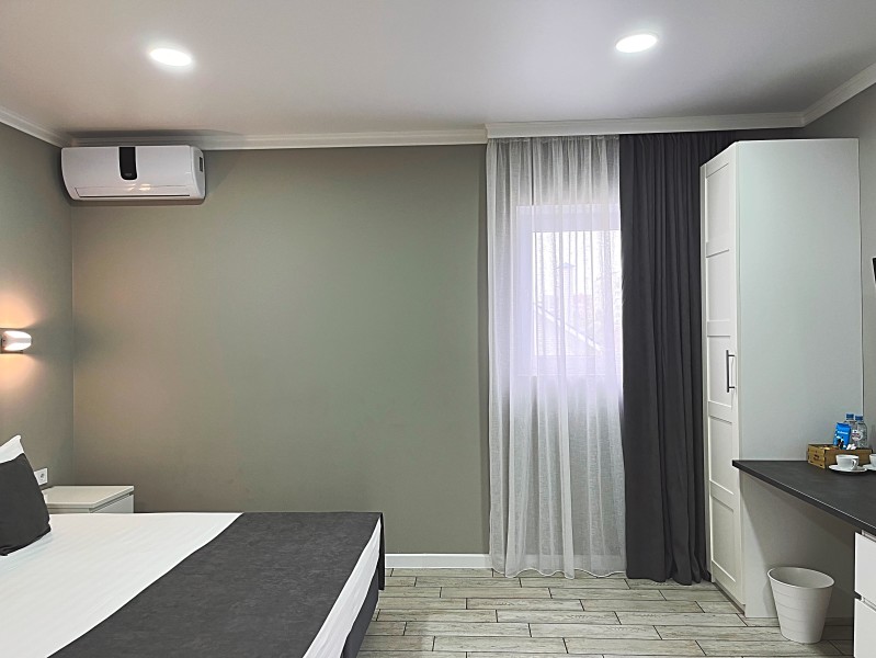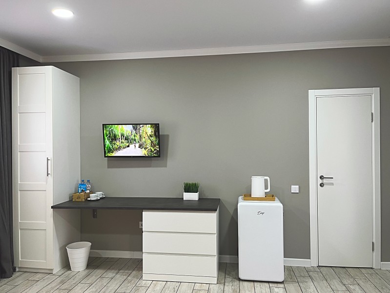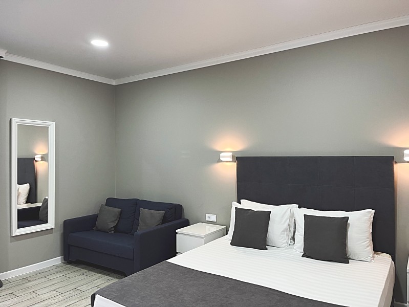 Номер с большой двуспальной кроватью и диваном кроватью. Расположен на втором этаже здания. Имеет собственную террасу с обеденным столом и креслами. Номер оснащен всем необходимым для комфортного отдыха: инверторная бесшумная сплит система, телевизор со smart tv, интернет по каналу Wi-Fi, удобный сан.узел с термостатическими смесителями, интерьерное освещение, большие панорамные окна, москитные сетки, постельное белье из белого страйп сатина, имеется меню из гиппоалергенных подушек, комплект махровых полотенец, комплект индивидуальных гигиенических средств (мыло, гель для душа, шампунь), пожарная сигнализация, теплый пол по всему помещению (для холодного времени года).